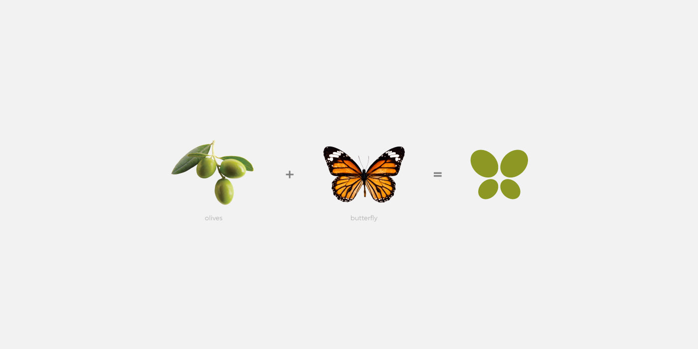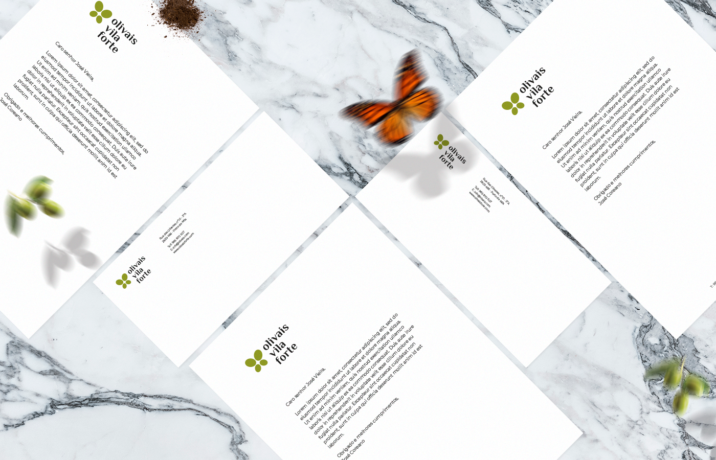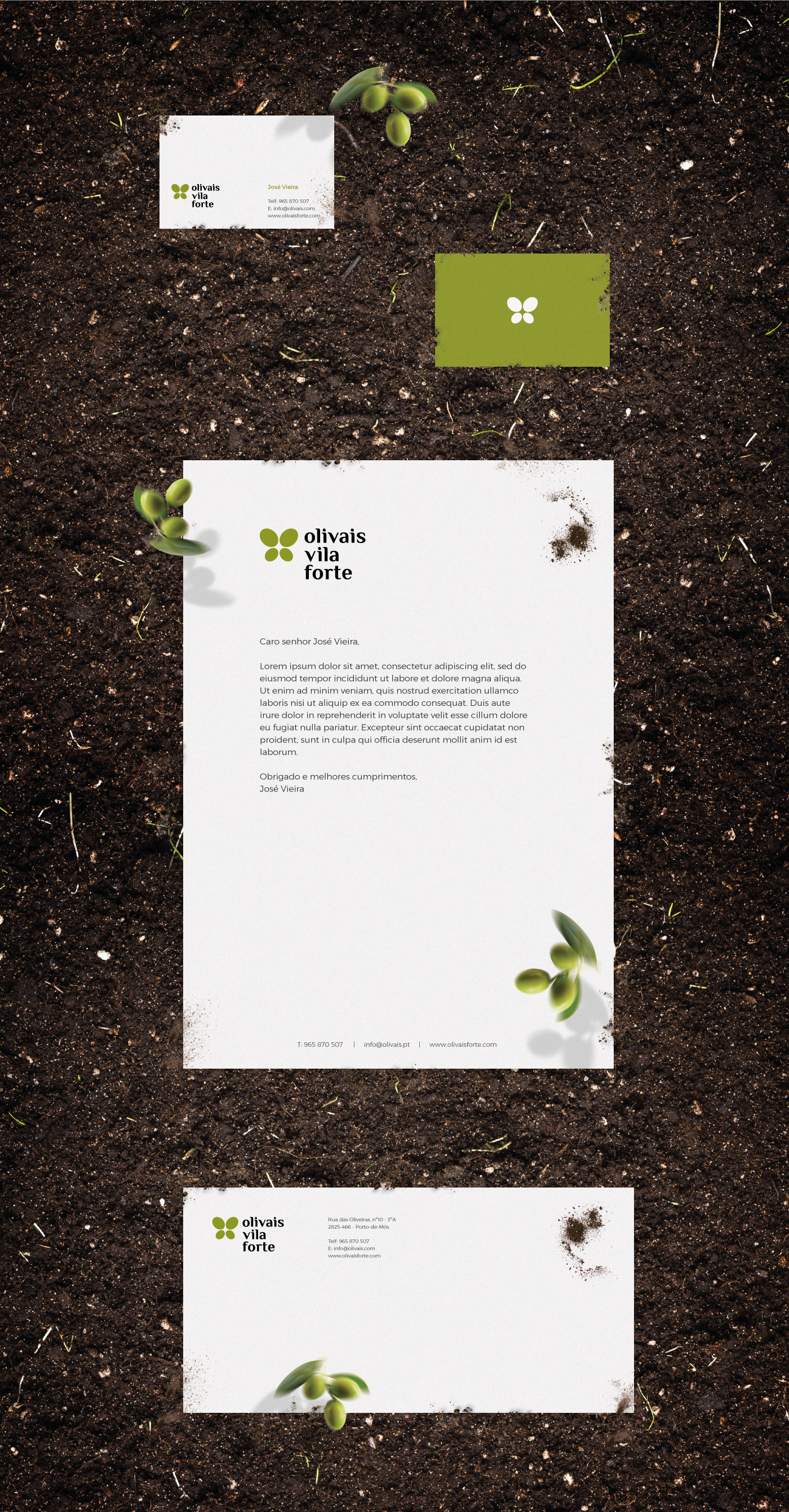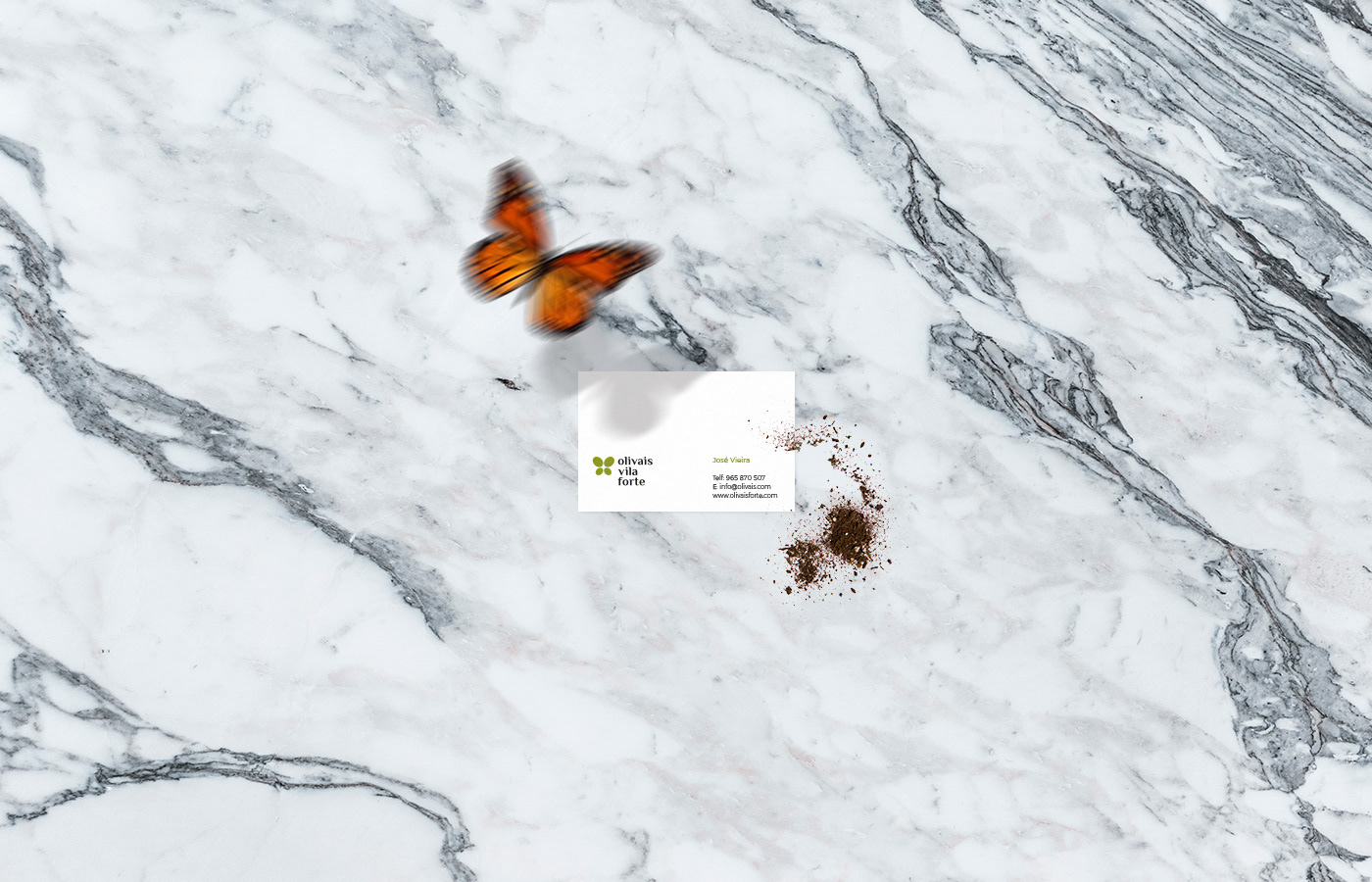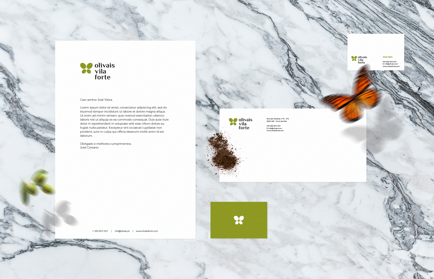 Olivais Vila Forte The client wanted a butterfly present in the logo to suggest the presence of insects in his olive groves, which are a sign of healthy environment practice, meaning chemical products are not present in olive groves. Challenge: Create a simple symbol that unifies a butterfly and olives, visually communicating healthy olive groves. The typography suggests quality and decades of experience in the work field.